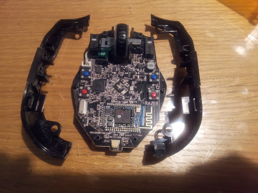 2013-05-12 16.28.24 Published May 12, 2013 at 3264 × 2448 in Tearing down a Razer Orochi Bluetooth gaming mouse Side parts removed