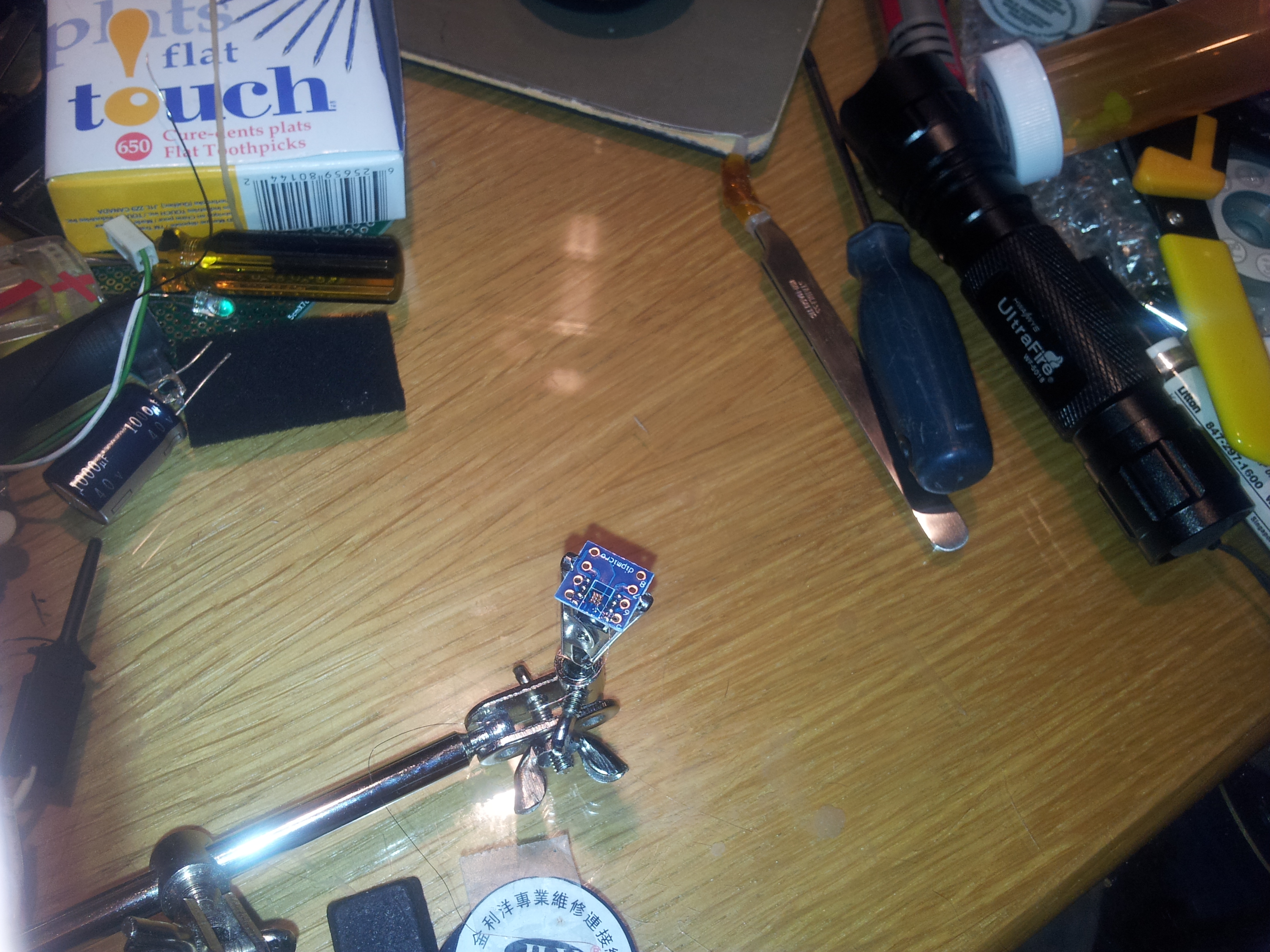 2013-06-14 15.37.07 Published June 15, 2013 at 3264 × 2448 in Convenient chips, inconvenient packages: Making use of the Texas Instruments bq27421-G1 lithium-ion battery fuel gauge chip