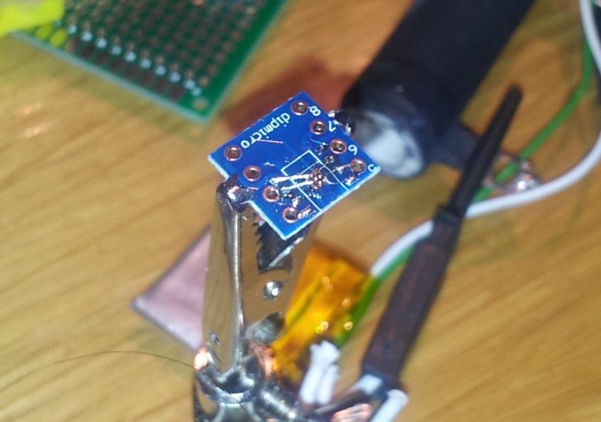 2013-06-14 15.47.14 Published June 15, 2013 at 1297 × 913 in Convenient chips, inconvenient packages: Making use of the Texas Instruments bq27421-G1 lithium-ion battery fuel gauge chip Chip partially soldered