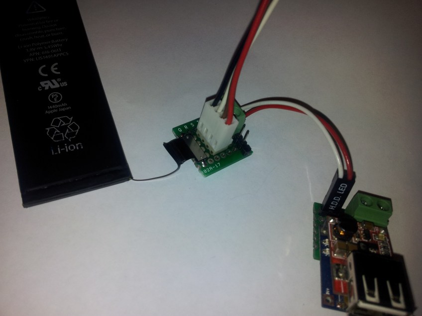 2014-08-22 03.43.03 Published August 31, 2014 at 3264 × 2448 in An Easy Hook-Up: Creating breakout Power/HDQ breakout boards for iPhone smart batteries iPhone 5 battery connected to board, with a load (boost converter) and HDQ connector for connecting to a PC
