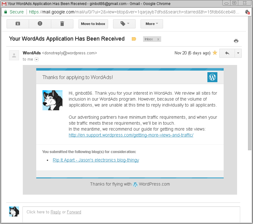 ss (2017-11-26 at 09.31.15) Published November 26, 2017 at 810 × 717 in Mini-Ramble: So… WordAds! Initial automatic reply from WordAds