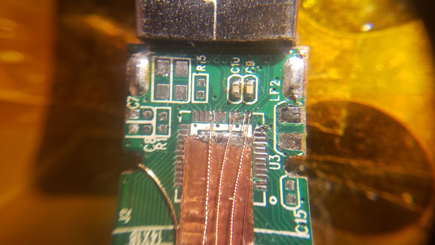 Twisted Pair Ending Published June 25, 2019 at 4032 × 2268 in Atomic Pi Adventures, Episode 1: Adding external PCI Express expansion by removing onboard Ethernet Super-tiny twisted pair hooked up to dead USB 3.0 drive PCB.