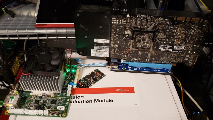 Atomic Pi, plus GPU Published June 25, 2019 at 3588 × 2016 in Atomic Pi Adventures, Episode 1: Adding external PCI Express expansion by removing onboard Ethernet External graphics card connected to the Atomic Pi. The card is bigger than the computer!