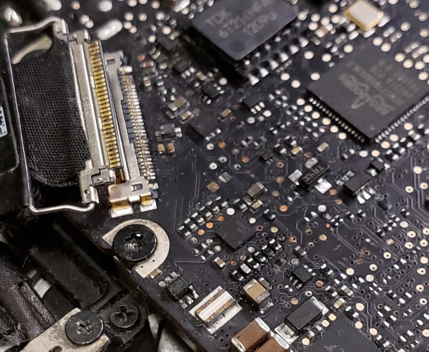 MacBook Pro A1278 Liquid Damage Published July 4, 2019 at 1405 × 1156 in Resurrecting a dead MacBook Pro (mid-2012 13-inch, model A1278) After cleaning up all the corrosion, lots of components and PCB traces have been corroded or lost entirely. Note the dark and tarnished probe points – they should be silver. The pads in the center used to have a fuse…