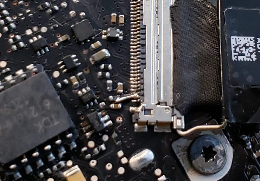 A1278 LCD Connector Repaired Published July 5, 2019 at 1169 × 816 in Resurrecting a dead MacBook Pro (mid-2012 13-inch, model A1278) Jumper from L9004 to pins 2 and 3 on J9000 backlight connector. Damage to Q4262 also visible.