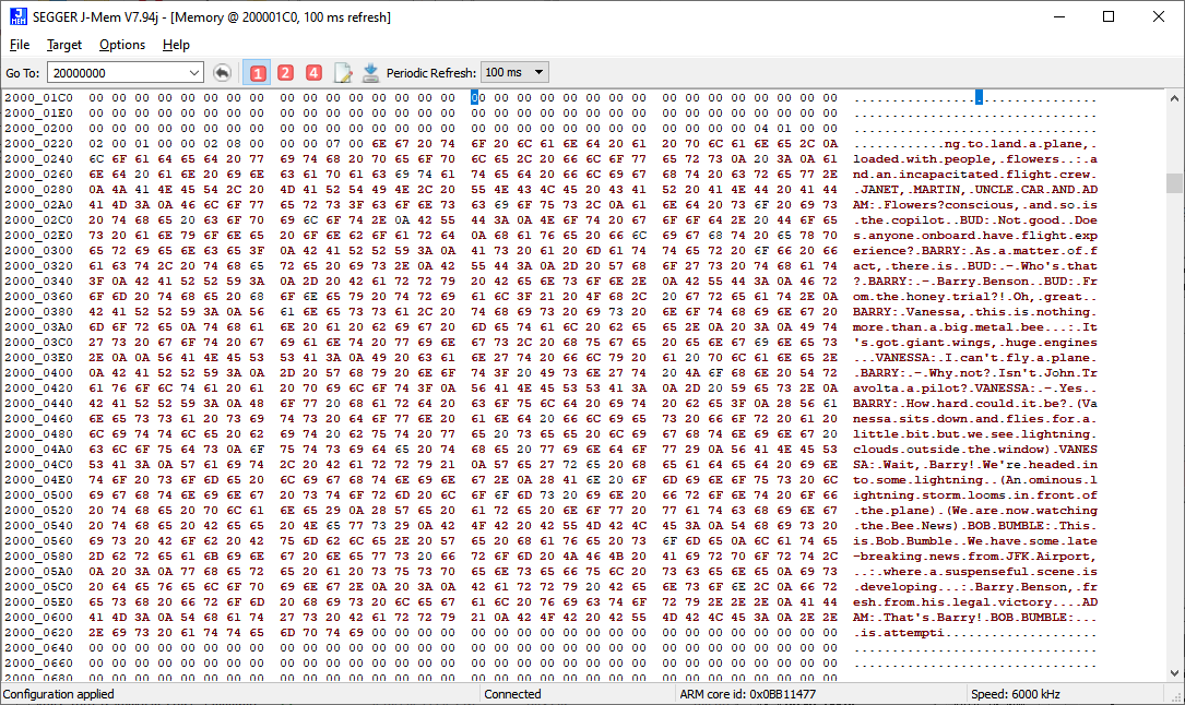 Bee Movie Script in RAM Published April 18, 2024 at 1085 × 646 in Dispo Adventures, Episode 1: Reverse-engineering and “running Windows 95” on a disposable vape with a colour LCD screen Copies of the Bee Movie script in SPI flash showing up in a RAM buffer. Copies of the Bee Movie script in SPI flash showing up in a RAM buffer.